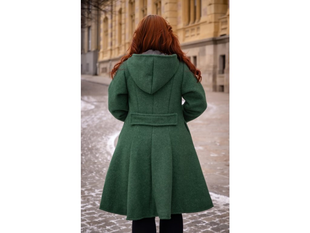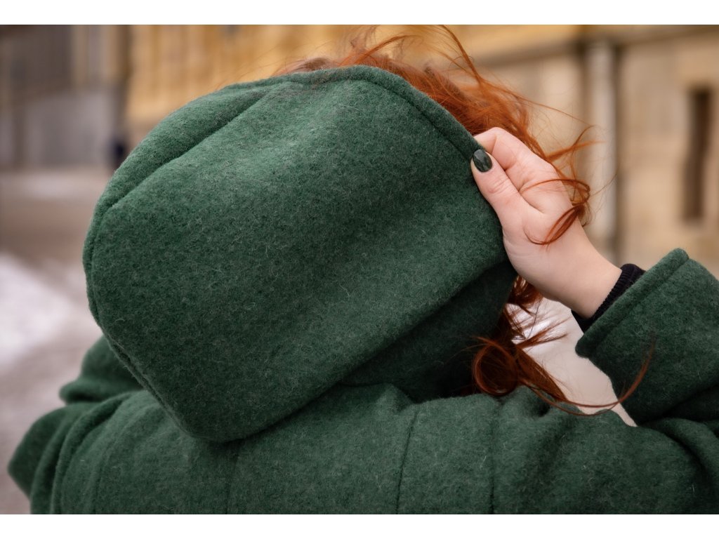 Kabát z vařené vlny s kapucí, zahřeje v chladných měsících aniž by schoval postavu.